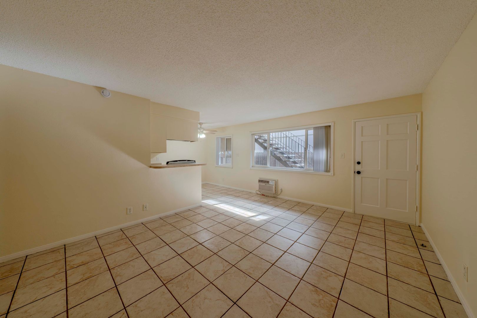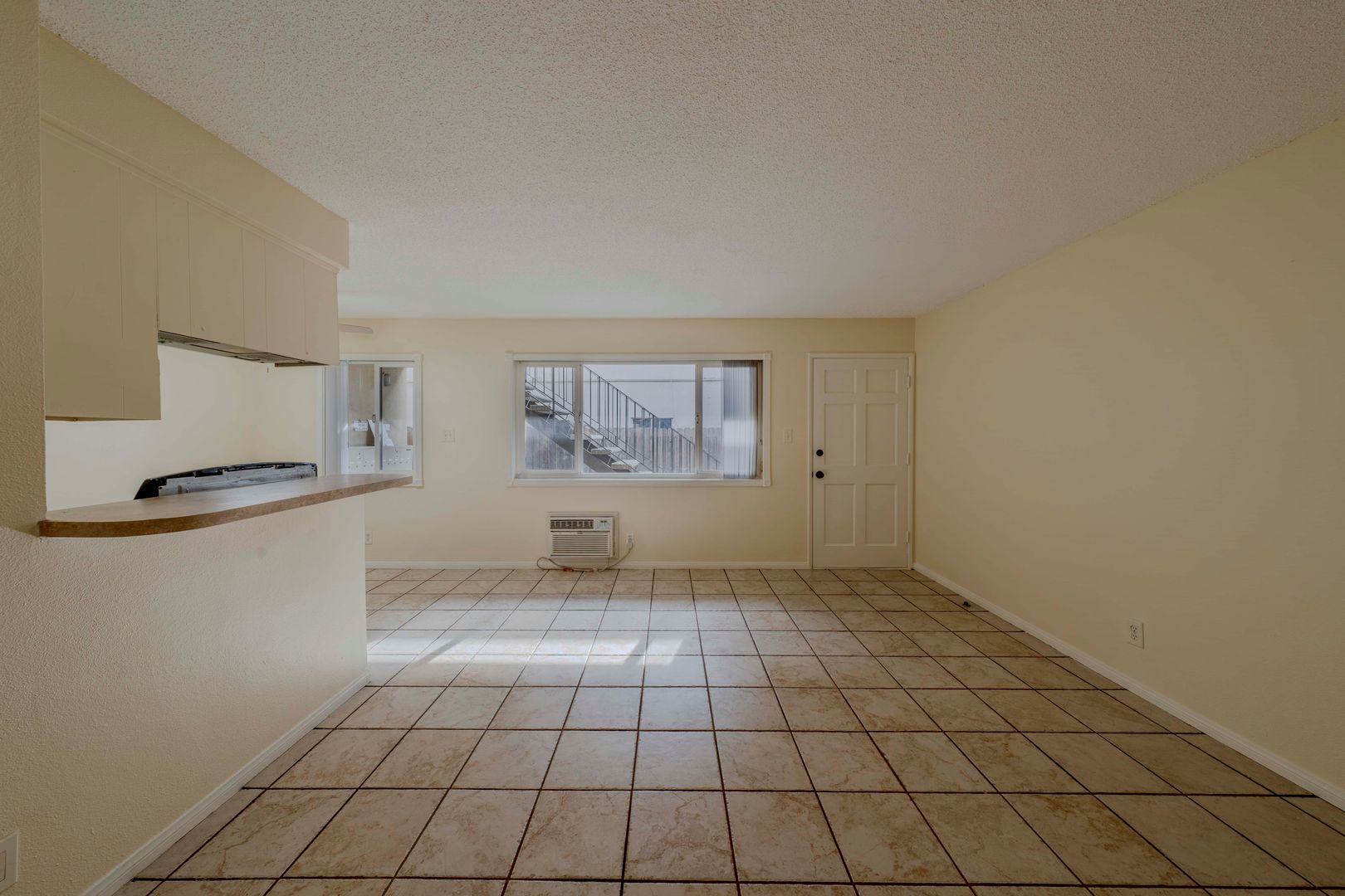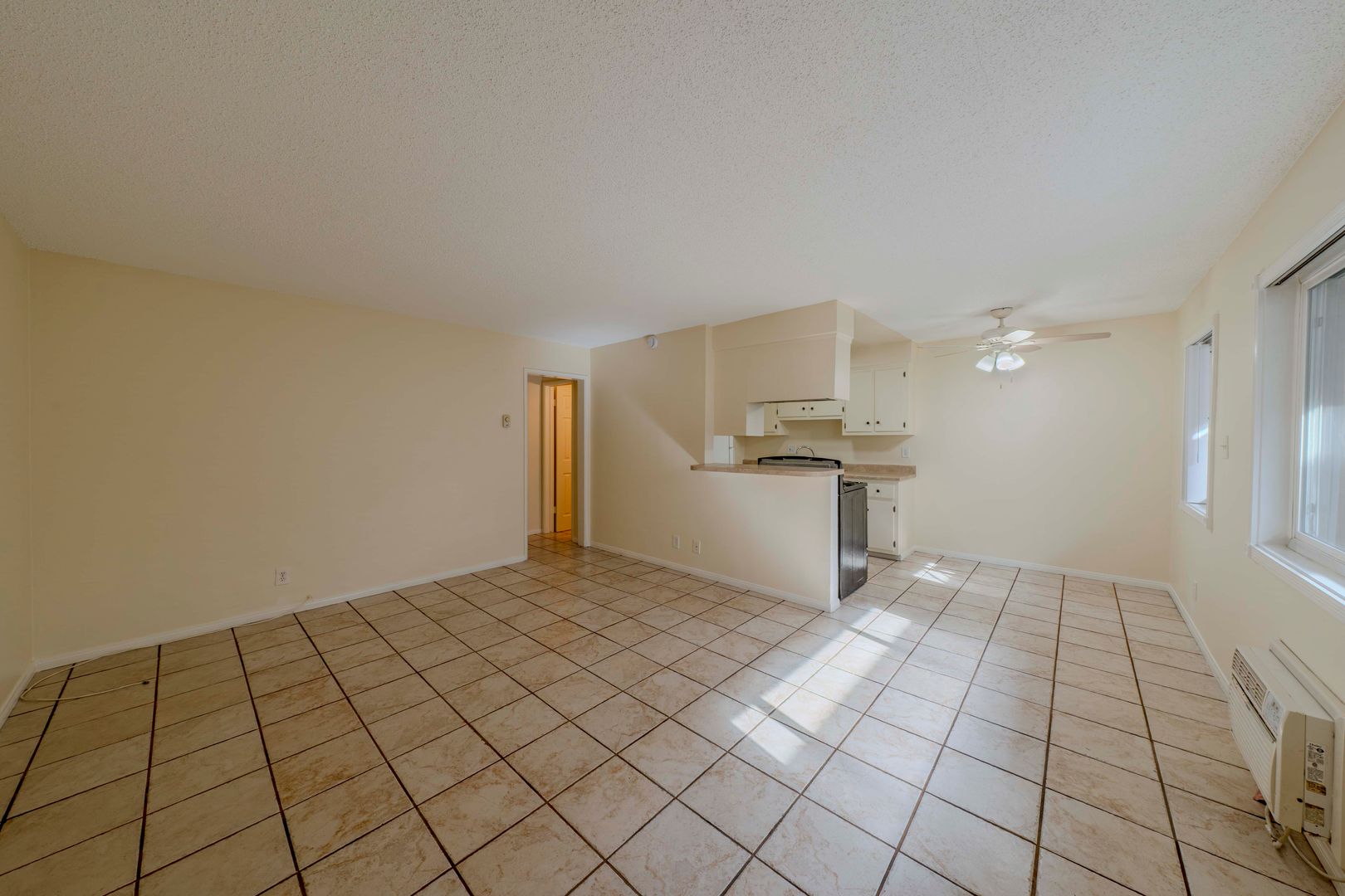 Step inside to discover an open, light-filled living space grounded by tile oversized windows. The updated kitchen features shaker-style cabinetry, and electric stove, built in microwave, refrigerator and a generous breakfast bar or dining area — ideal for both everyday living and entertaining.